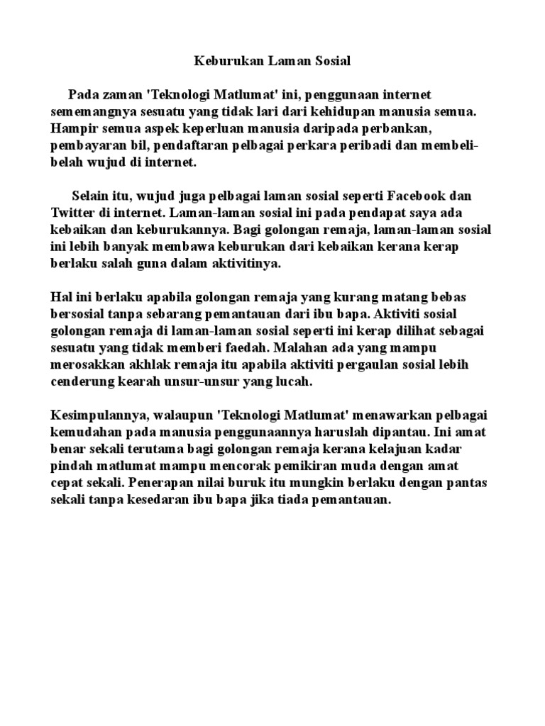 Kepentingan laman sosial untuk golongan remaja. Kesimpulannya penggunaan laman sosial ini mendatangkan pelbagai kebaikan dan keburukan kepada golongan remaja. Orang luar sentiasa memerhatikan tindak-tanduk golongan remaja seperti korang. Tindakan sedemikian boleh terjadi ekoran terlalu taksub kecewa atau terpengaruh dengan kandungan di media sosial sehingga diri gagal membuat pertimbangan wajar.